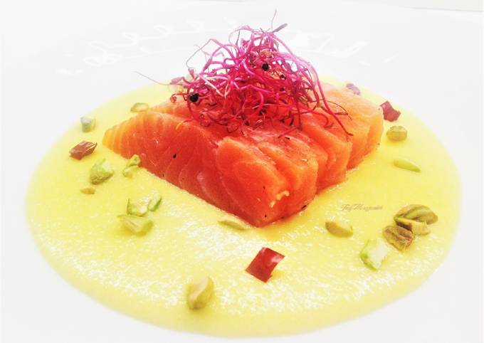 Easiest Way to Make Award-winning Sashimi di salmone con crema di mango al peperoncino e germogli di bietola rossi