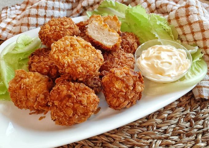 Succosi bocconcini di pollo all'interno di una croccante panatura. Il termine Nugget significa letteralmente "Pepita", che richiama qualcosa di "dorato". Per questa versione e per un'extra croccantezza abbiamo scelto di fare una doppia panatura all'interno dei cornflakes.